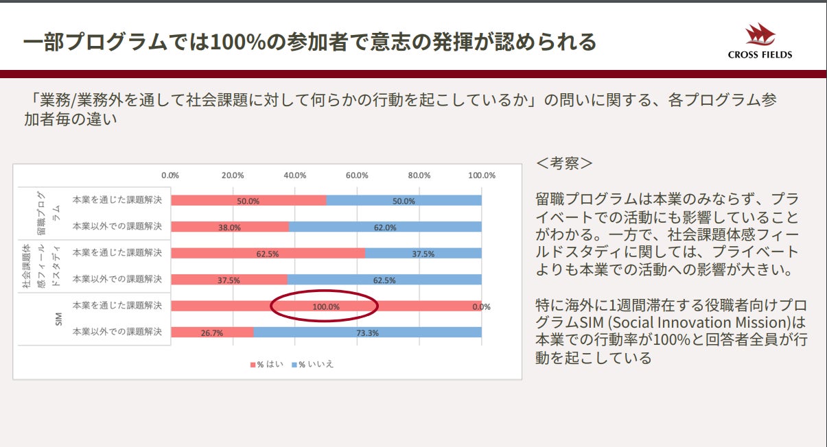 クロスフィールズでは今後も定期的なプログラム参加者へのアンケート調査を通じて、越境学習経験者がもたらす社会インパクトを測っていくと同時に、より効果的な越境プログラムを提供するための研究開発を継続していきます。
