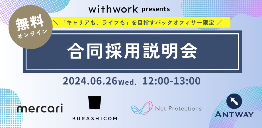 チーム発足を記念して、イベント「オンライン合同採用説明会 〜『キャリアも、ライフも』を目指すバックオフィサー限定〜」を開催いたします。本イベントでは、働き方の柔軟性もありながら、働きがいのある企業4社にご参加いただきます。