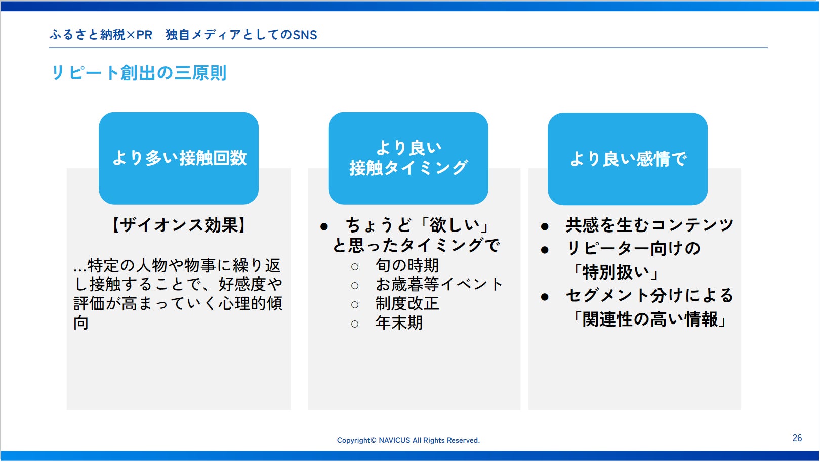 そこで、今回のセミナーテーマである「リピート創出」のための三原則として