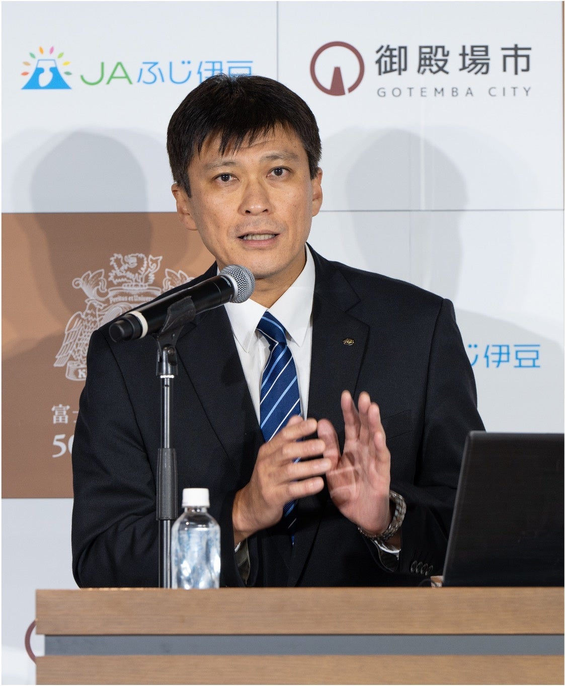 まず、キリンディスティラリー株式会社 代表取締役社長 押田 明成が登壇し、本年で50周年を迎えた富士御殿場蒸溜所の50年の歩みと今回新たな試みとなる「御殿場モルトウイスキー」の製造開始への思いを話しました。「この50年は苦難の歴史とも言えます。一時期は最盛期の1/4程度まで市場が縮小し、当社も長く苦しい時代が続きました。今もこうしてウイスキーをつくり続けることができているのは、行政や地域のご支援があったからこそです。50年間御殿場で事業を続けてこられたことへの感謝を「御殿場モルトウイスキー」の製造という新たな取り組みの形で表すとともに、御殿場でつくられたウイスキーの魅力を国内はもちろん、さらに世界に発信していきたいという思いです。」