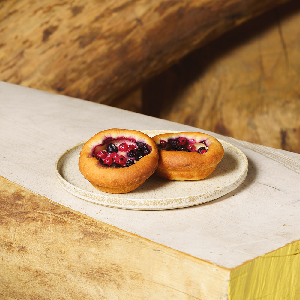 ふわふわの菓子パン生地にサワーカスタードを敷き詰めカシス、グロゼイユ、ワイルドブルーベリーをトッピングし焼き上げました。