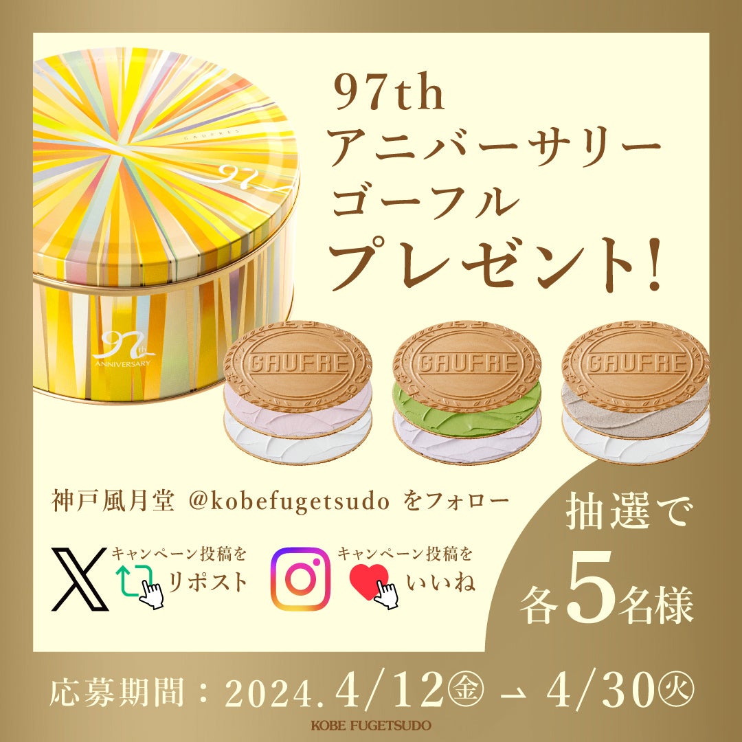 97周年アニバーサリー商品の販売に先駆けて4月12日(金)より、神戸風月堂公式XとInstagramにて『97thアニバーサリーゴーフル』が当たる、プレゼントキャンペーンを同時開催します。