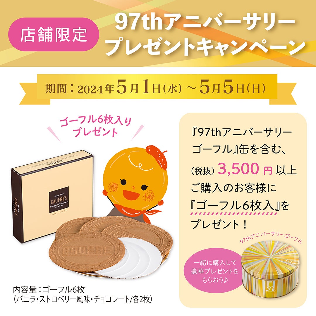 5/1~5/5のゴーフルデー期間中に、神戸風月堂の店舗で対象商品の『97thアニバーサリーゴーフル缶』を含む3500円以上(税抜)の商品をご購入いただいたお客様に『ゴーフル6枚入り』をプレゼントします。