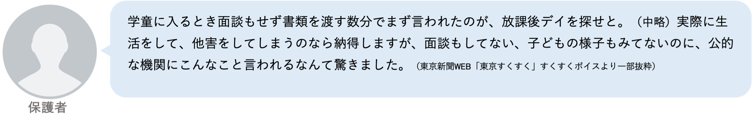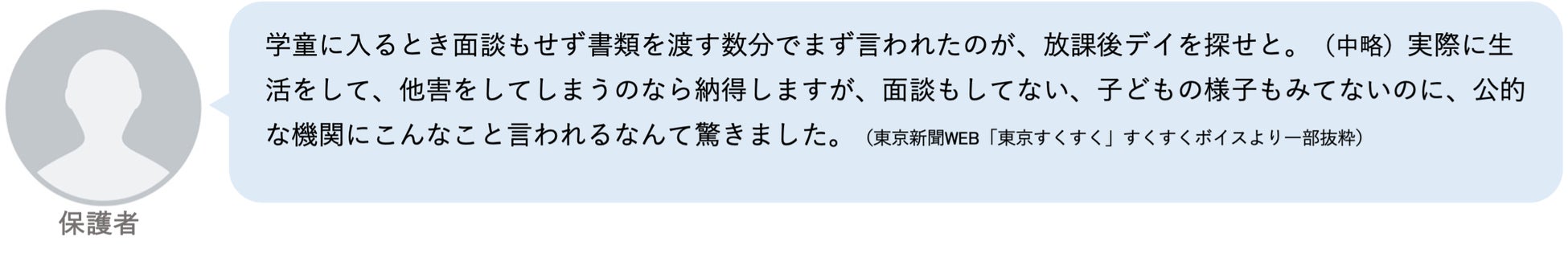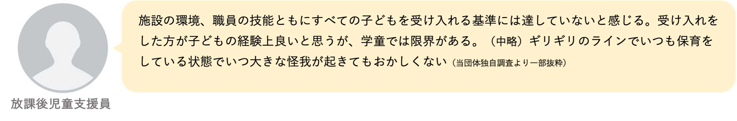 申し込みさえ出せばすべて受け入れることになっている。定員というものもなく、どんなに人数が増えても詰め込むだけ詰め込んでいて、個別に配慮が必要な子もすべて受け入れている。現場にはもう限界が来ているという話をしても何も変わることはなく、職員は疲弊している。