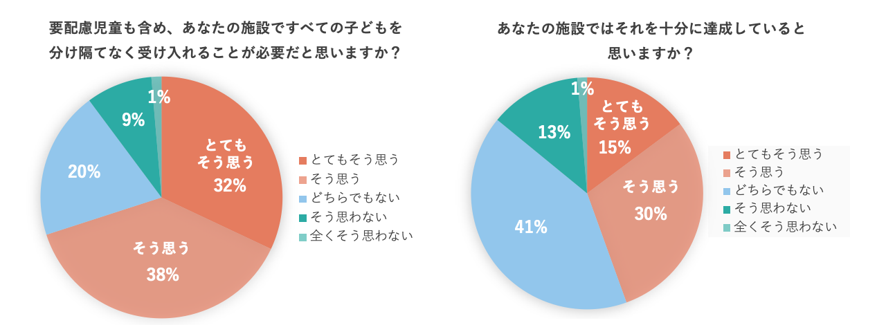 要配慮児童を含めすべての子どもを受け入れる必要性は認識されている一方、「十分に受け入れられている」と答える割合は50%に満たなかった。
