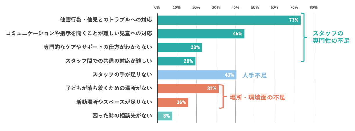 受け入れにあたっての課題を聞くと、「他児とのトラブルへの対応(73%)」や「コミュニケーションが難しい児童への対応(45%) 」など、スタッフの専門性の不足についての回答が多くあがりました。また、人手不足や場所・環境面の不足も問題になっていることも伺えました。