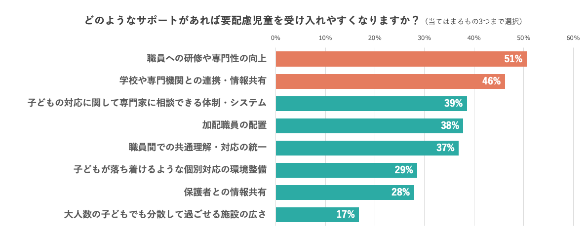 要配慮児童の受け入れにあたってどのようなサポートがあるとよいかを聞くと、「職員への研修や専門性の向上(51%)」が最多、次いで「学校や専門機関との連携・情報共有(46%)」という回答が多くあがりました。