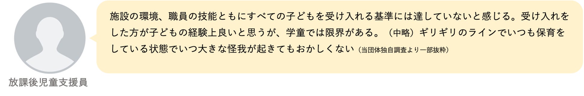 2023年4月に「こども基本法」が施行され、「こどもの権利」保障に向けた動きが加速するなか、こども家庭庁は「こどもの居場所づくりに関する指針」において、子どもの視点に立った居場所づくりの重要性を示した上で、放課後児童クラブや放課後等デイサービスをはじめ、すべての子どもが放課後を安心・安全に過ごせるための多様な居場所づくりの推進に力を入れる方針を掲げています。そのような流れがある一方、子どもの特性や言動を理由に放課後児童クラブを「やめさせられた」という保護者の嘆きがSNS等に投稿されることが未だなくならず、放課後の居場所において適切な支援や配慮ができていない現状が垣間見えます。今回の調査をきっかけに、配慮が必要な子どもの受け入れにあたっての課題が明らかとなり、解消に向けた取り組みが進むことを期待しています。