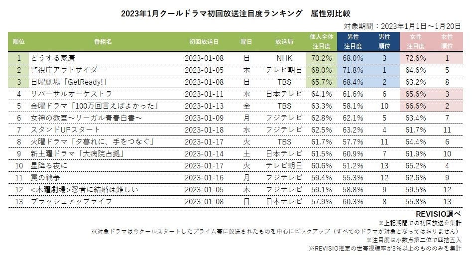 プライム帯を中心として、1月からスタートした冬ドラマから13個のドラマをピックアップし*、REVISIO独自の注目度という指標によって初回放送の「注目度ランキング」を作成いたしました。男性と女性で、注目しているドラマの違いが明らかになっています。