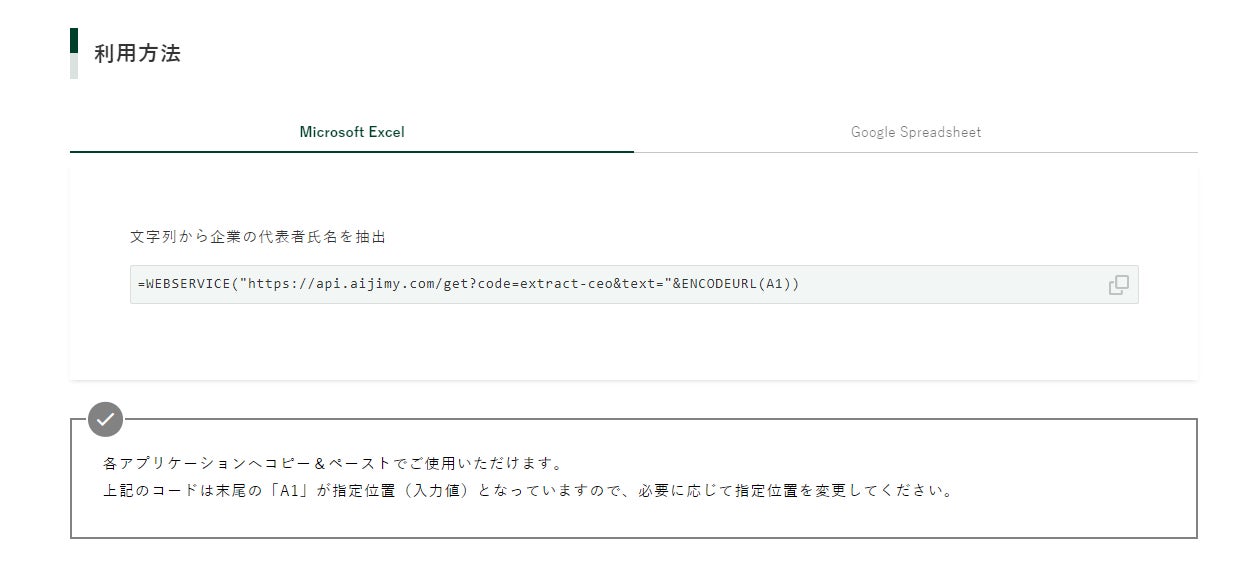 Webサイト上の関数をExcelやGoogleスプレッドシートにコピペするだけで利用できます。