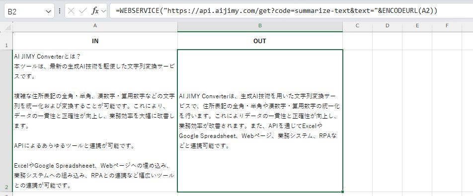 AI JIMY ConverterのWebサイトへアクセスし、利用したい関数をExcelやGoogleスプレッドシートにコピペします。