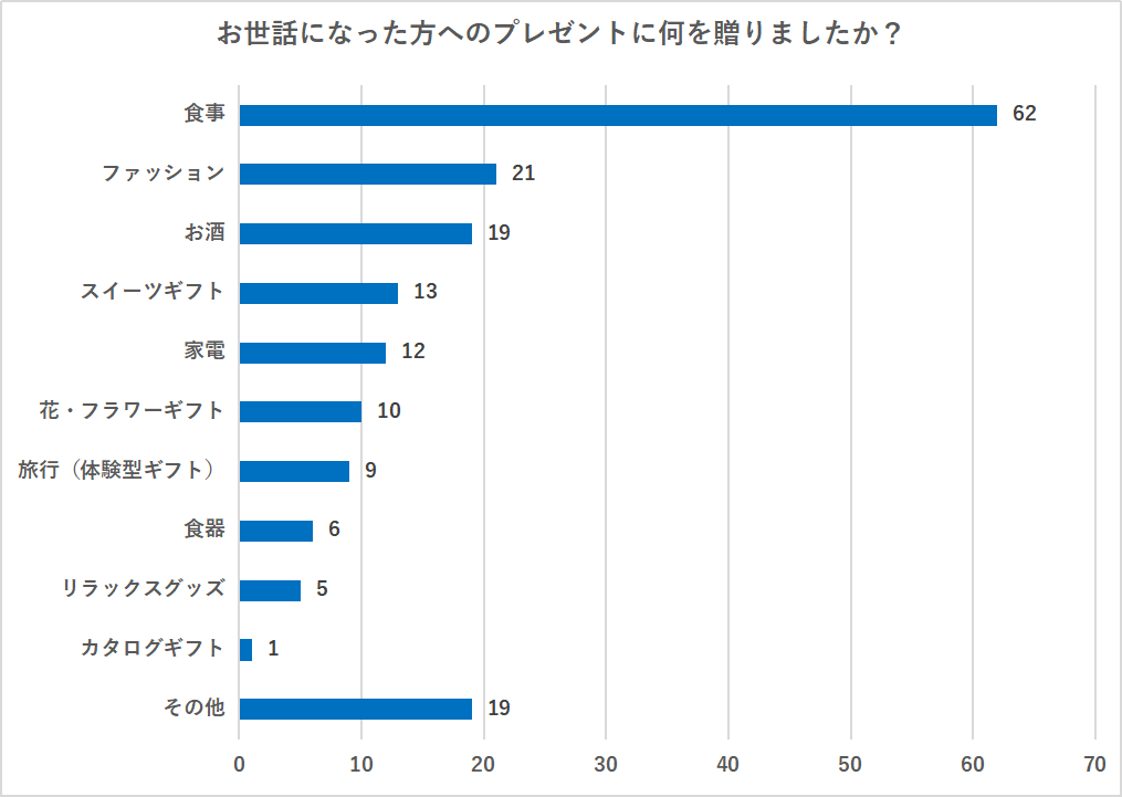 次いで「ファッション」「お酒」「スイーツギフト」となっており、さまざまな選択肢があるプレゼントの中でも食品飲料系が上位を占めています。
