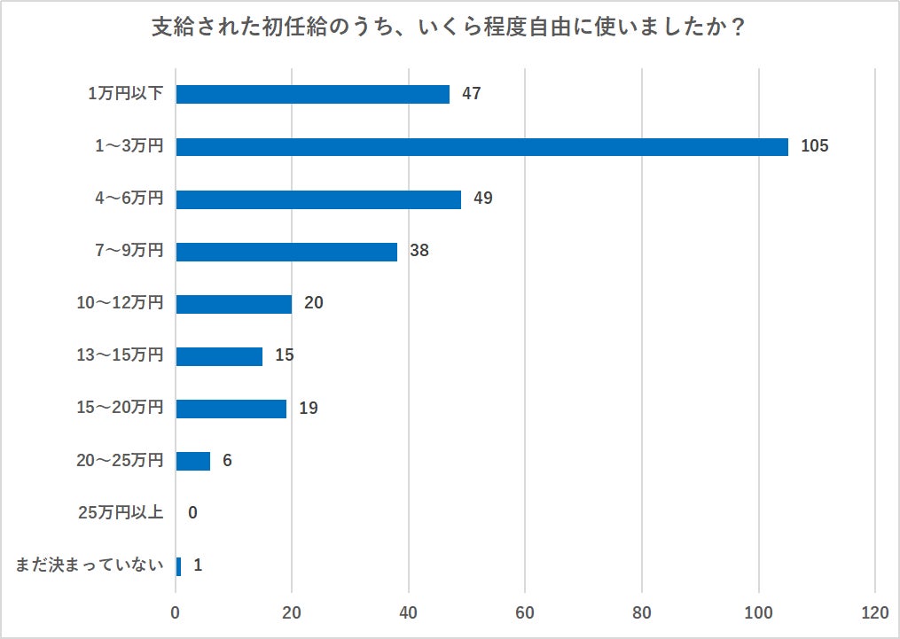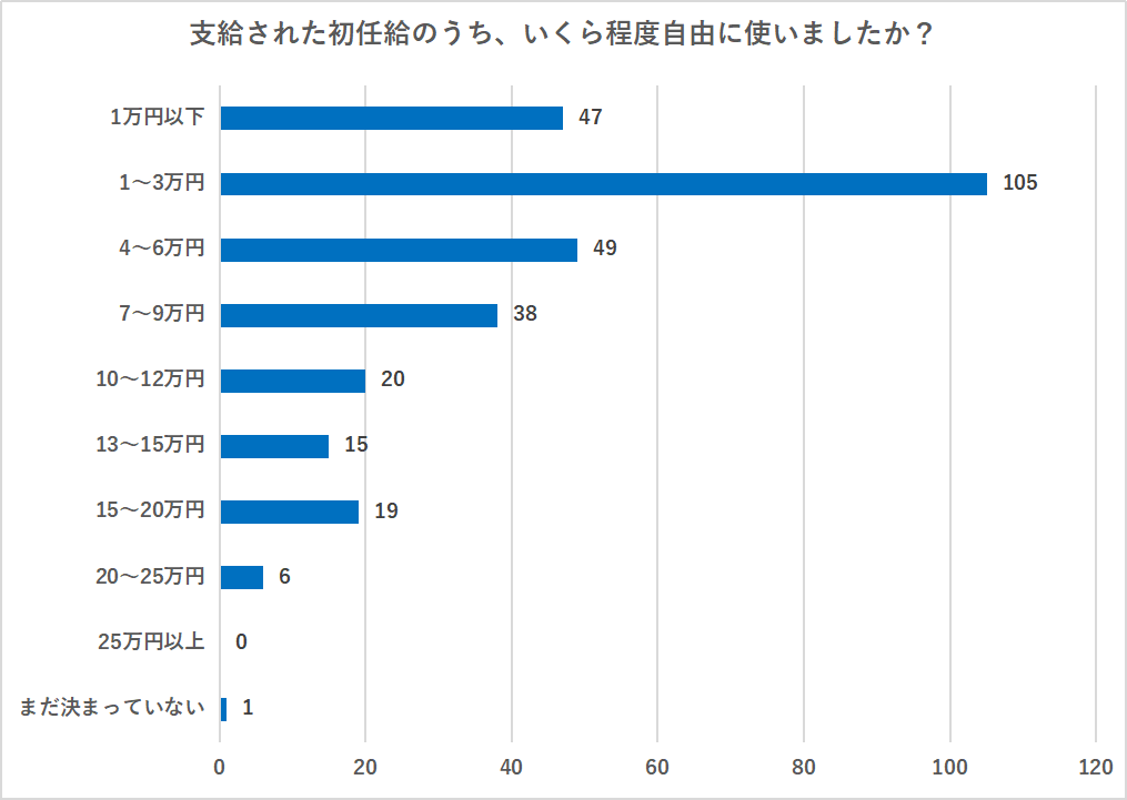 結果として、支給された初任給のうち「1~3万円」程度を自由に使い、残りは生活費や貯金に回す方が多い結果となりました。
