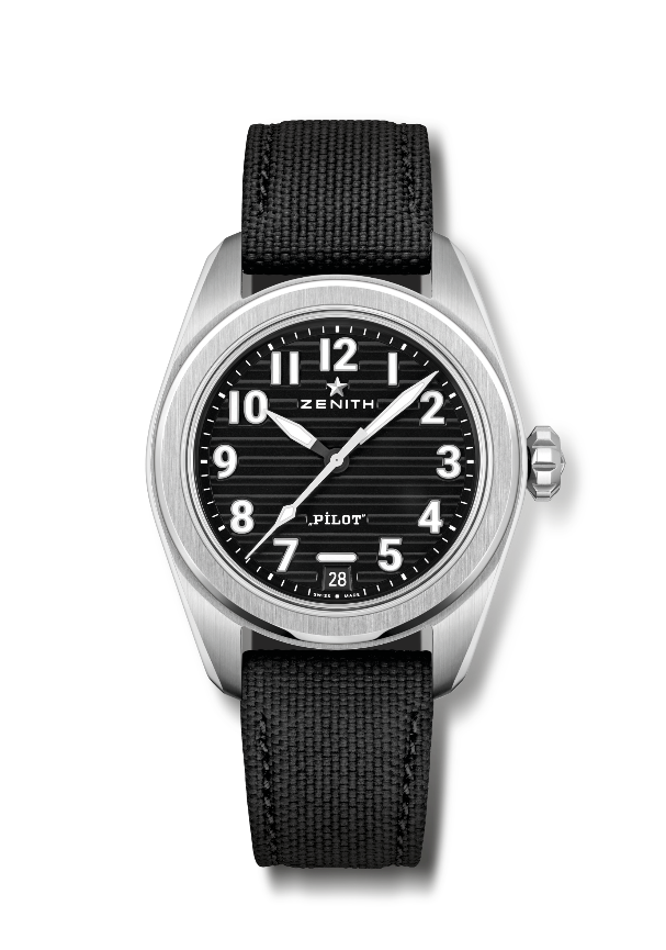 ゼニス パイロットウォッチの新世代モデルであるパイロット オートマティックは、コレクションの美的コードを振り返り、繊細なディテールが溢れる傑出したシルエットを実現しています。40mmのステンレススチール製またはブラックセラミック製ケースに収められたパイロット オートマティックは、全体的に新しいケースデザインが特徴的で、ラウンドケースの上には、固定されたフラットトップ ラウンド型ベゼルが採用されています。スチール製バージョンでは、表面に縦方向のサテンブラッシュド仕上げとポリッシュ仕上げの面取りが施されています。またブラックセラミック製バージョンでは、全体にマイクロブラスト仕上げが施され、さりげないマット仕上げになっています。パイロットウォッチの特徴である大型リューズは、よりモダンで角張ったフォルムとなっていますが、手袋をしたままでも行いやすい操作性はそのままです。