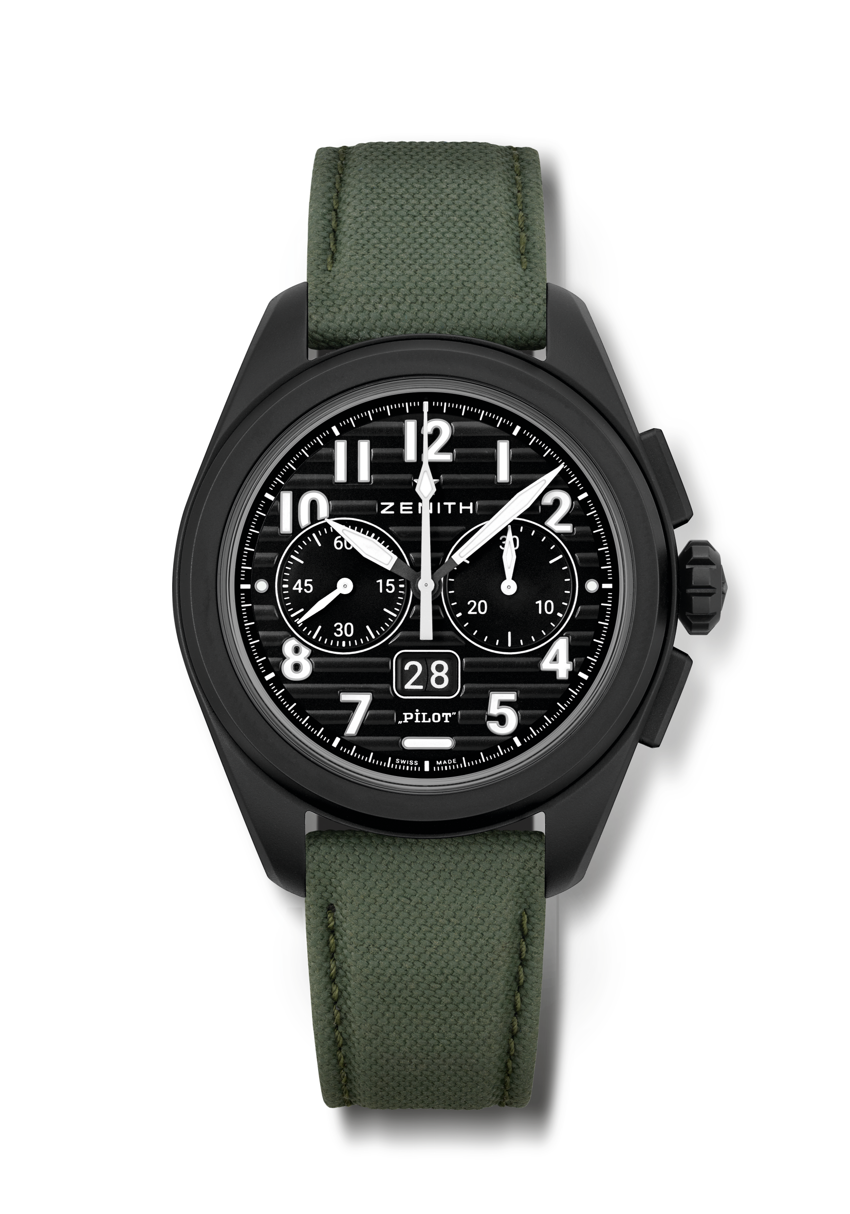 ブラックオパラインの文字盤には横方向の溝が施され、古い航空機の機体を構成する波型のメタルシートに似せています。1900年代初頭からゼニスのパイロットウォッチやダッシュボード計器の特徴であり続けるオーバーサイズの夜光アラビア数字が、よりモダンなフォントとなり、ホワイトのスーパールミノバが塗布されたメタルマーカーとして施されています。6時位置の日付窓には、夜光アワーマーカーが白いフラットな線としてあしらわれ、飛行機の人工水平器を思い起こせます。ここでは、装着者が時計の向きを瞬時に判断し、疑いを持つことなく時刻を読み取ることができます。文字盤には「Pilot」のサインが入っていますが、これはゼニスが、この文字を文字盤に施す権利を保持する最初で唯一のブランドであるためです。