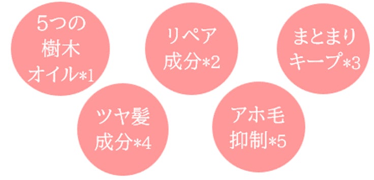 *うるおいを与え、保つこと *1 アルガニアスピノサ核油、スクレロカリアビレア種子油、オリーブ果実油、アストロカリウムムルムル種子脂、テリハボク種子油(すべて保湿成分) *2 加水分解水添デンプン、加水分解コラーゲンPGプロピルメチルシランジオール、メドウフォーム-δ-ラクトン(すべて補修成分) *3 ヘマチン、加水分解ケラチン(羊毛)(補修成分) *4 γ-ドコサラクトン(補修成分) *5 (ジヒドロキシメチルシリルプロポキシ)ヒドロキシプロピル加水分解ケラチン(羊毛)(補修成分)