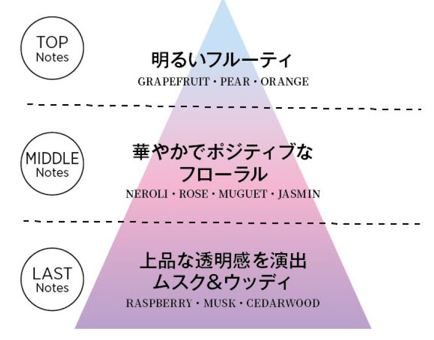 上品でしとやかな花々と、瑞々しいフルーツやジャスミン、ネロリなどのホワイトフローラルブーケを特徴とし、おしゃれやヘアスタイルを楽しむ明るくポジティブな女性をイメージした幸福で透明感のあるフルーティ・フローラル調の香り。