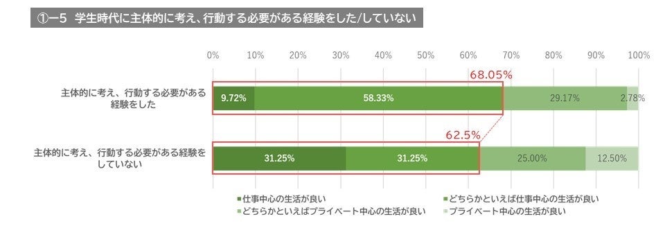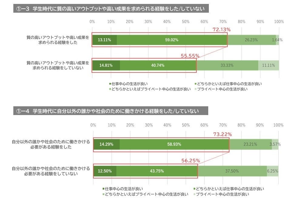 ●それぞれの「経験をした」と回答している学生は、プライベート以上に仕事に比重を置きたいという志向が高いことが分かりました。一方で、それぞれの「経験をしていない」学生は、プライベートを重視する傾向があることが分かりました。