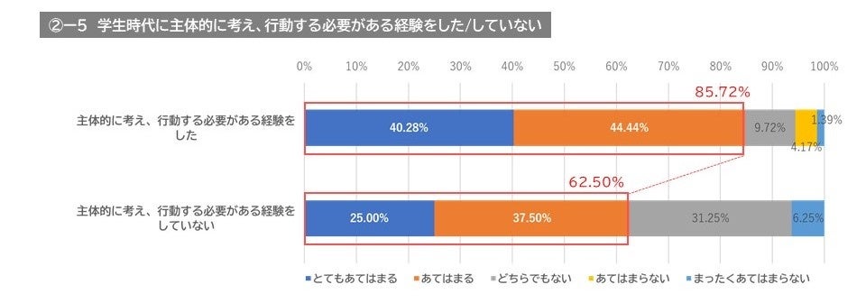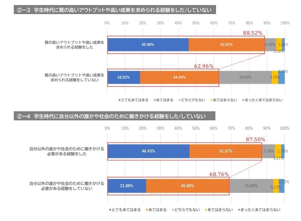 今回の調査対象である学生の具体的な経験内容は、アルバイト、長期インターンシップ、ボランティア活動、研究活動など様々な経験が含まれています。学生のうちから、様々な経験から学びを得ることで、20代の過ごし方や、仕事価値観の醸成に影響することが分かりました。質問②から見られるように、各経験を「した」と回答した学生は、ワークハード仕事価値観が高い傾向にあり、成長につながるハードさを求めていると考えます。