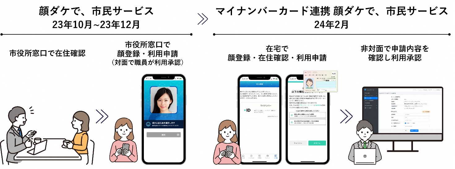 2023年10月から12月まで実施した「顔ダケで、市民サービス」の継続の取組みとして実施し、顔認証サービスへの登録に手間がかかるといった課題を、スマートフォンのアプリ上で完結させ、利便性を向上させます。