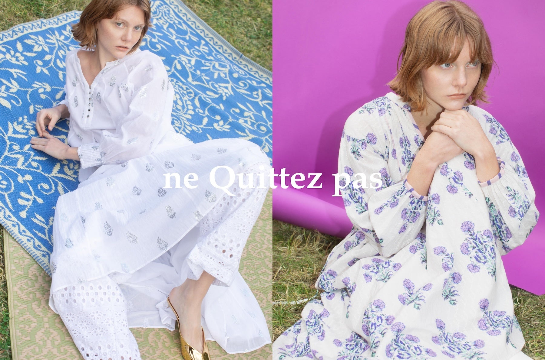ne Quittez pas (ヌキテパ)は、インドの伝統的なテクニックのヘリテージとモダンなデザインが融合したブランドです。インドのオリエンタルなムードを彷彿とさせる、鮮やかなカラーパレットやプリントや手刺繍を特徴としたデイリーウェアを提案します。
