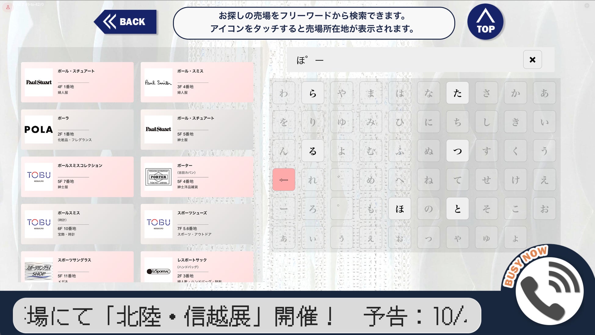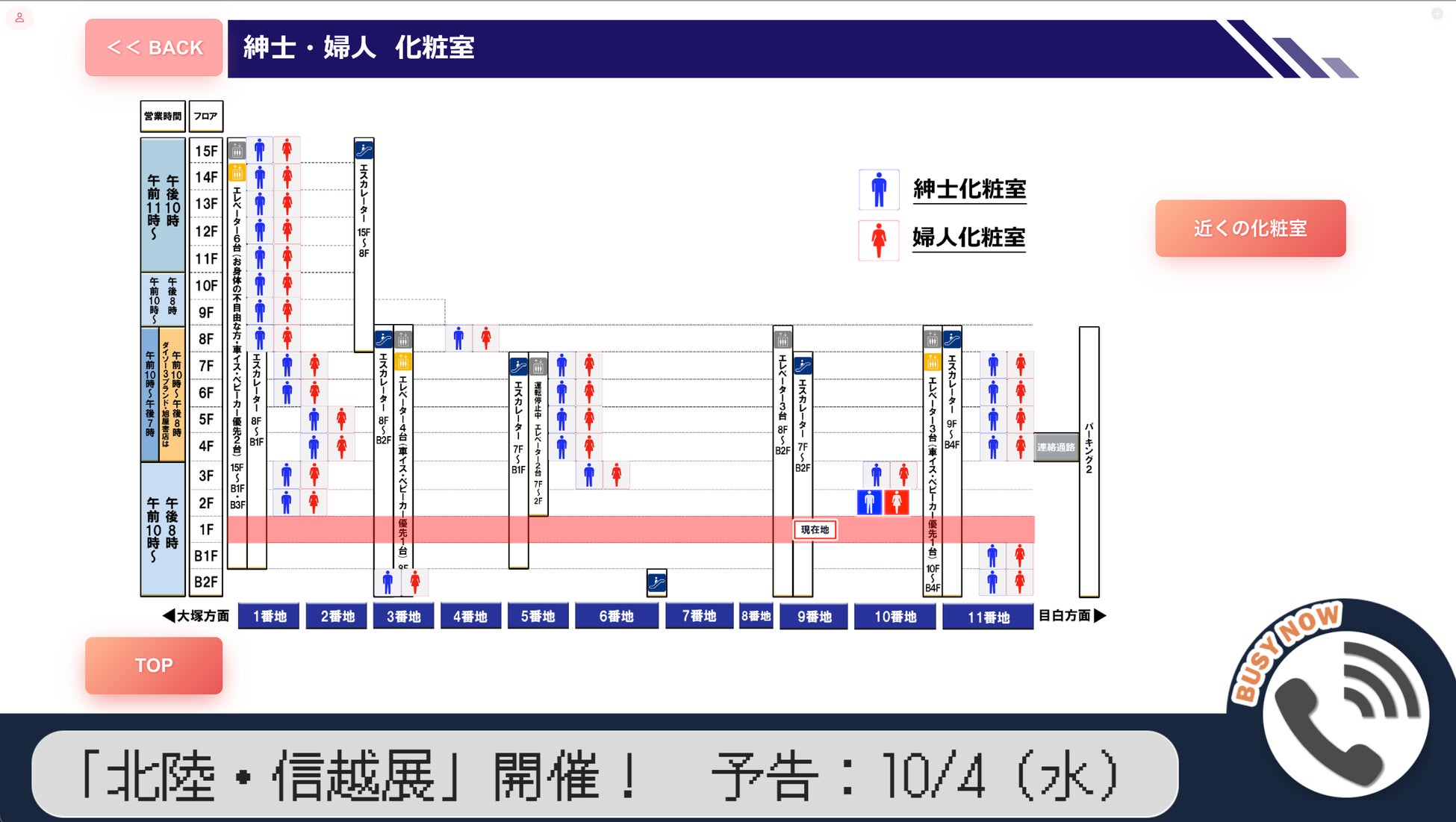 ボタンを選ぶことで、店内の案内図やサービスに関する説明を確認できます。