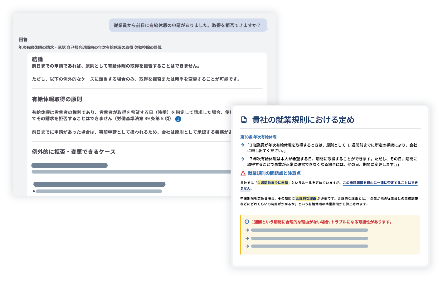 例えば、「年次有給休暇の付与」について質問した場合、分割付与を実施している会社においても、これまでは「入社6ヶ月後に10日付与されます」といった法定基準どおりの回答が提示されていましたが、アップデート後は、「貴社の就業規則第○条によれば、正社員の場合、入社時に5日が付与され、入社6ヶ月後に5日が付与されます。また、以降は入社日を基準日として付与されます。」というように、自社の規程に即した回答が得られるようになります。