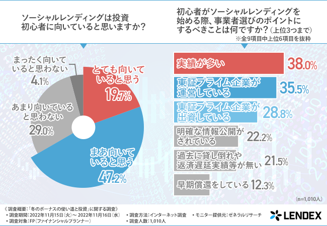 続いて、「初心者がソーシャルレンディングを始める際、事業者選びのポイントにするべきことは何ですか?(複数回答可)」と質問したところ、『実績が多い(38.0%)』と回答した方が最も多く、次いで『東証プライム企業が運営している(35.5%)』『東証プライム企業が出資している(28.8%)』と続きました。