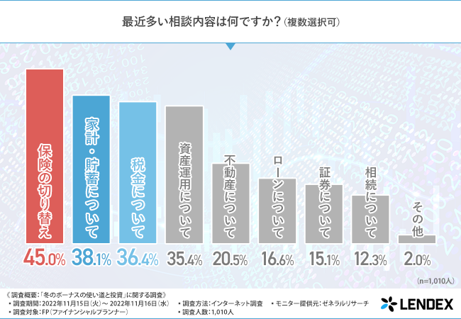 「最近多い相談内容は何ですか?(複数選択可)」と質問したところ、『保険の切り替え(45.0%)』と回答した方が最も多く、次いで『家計・貯蓄について(38.1%)』『税金について(36.4%)』と続きました。