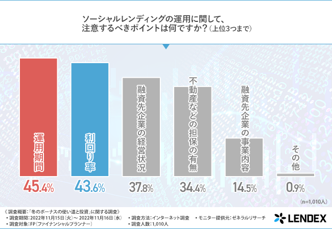 そこで、「ソーシャルレンディングの運用に関して、注意するべきポイントは何ですか?(複数回答可)」と質問したところ、『運用期間(45.4%)』と回答した方が最も多く、次いで『利回り率(43.6%)』と続きました。