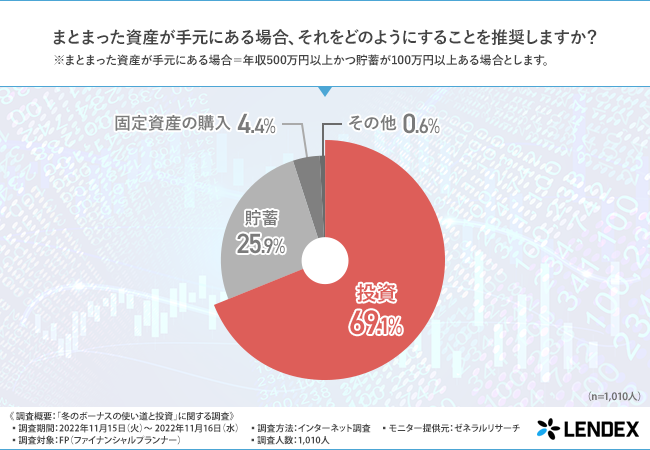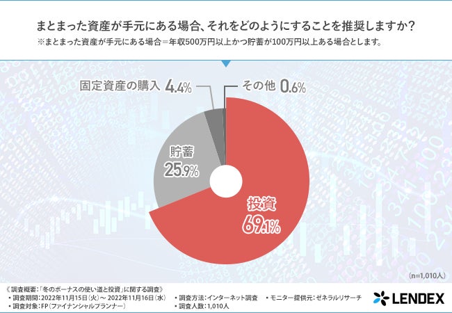 そこで今回、ソーシャルレンディングサービスを提供する株式会社LENDEX(https://lendex.jp)は、FP(ファイナンシャルプランナー)を対象に、「冬のボーナスの使い道と投資」に関する調査を実施しました。