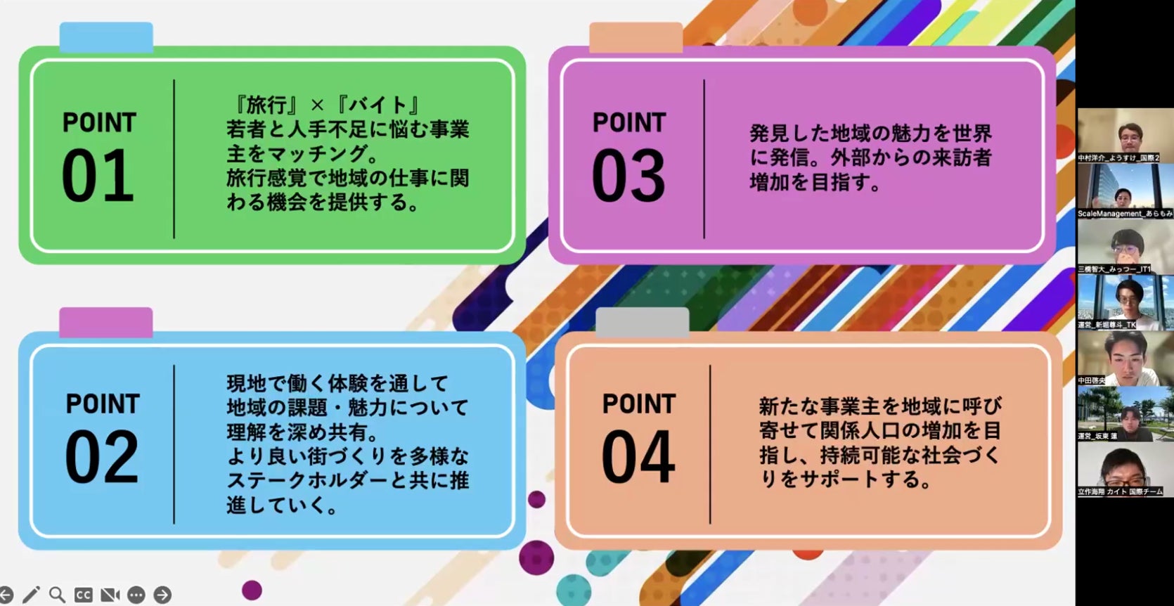 【優勝チーム事業内容:「英語の実践機会を創出する新サービス!英語学習者と外国人観光客をつなぐマッチングプラットフォームを提供。英語を話す機会が少ない学習者には観光客との会話を通じて実践の場を提供し、観光客は現地情報や交通案内などのサポートを受けながら、より豊かな旅行体験を提供するサービス。】