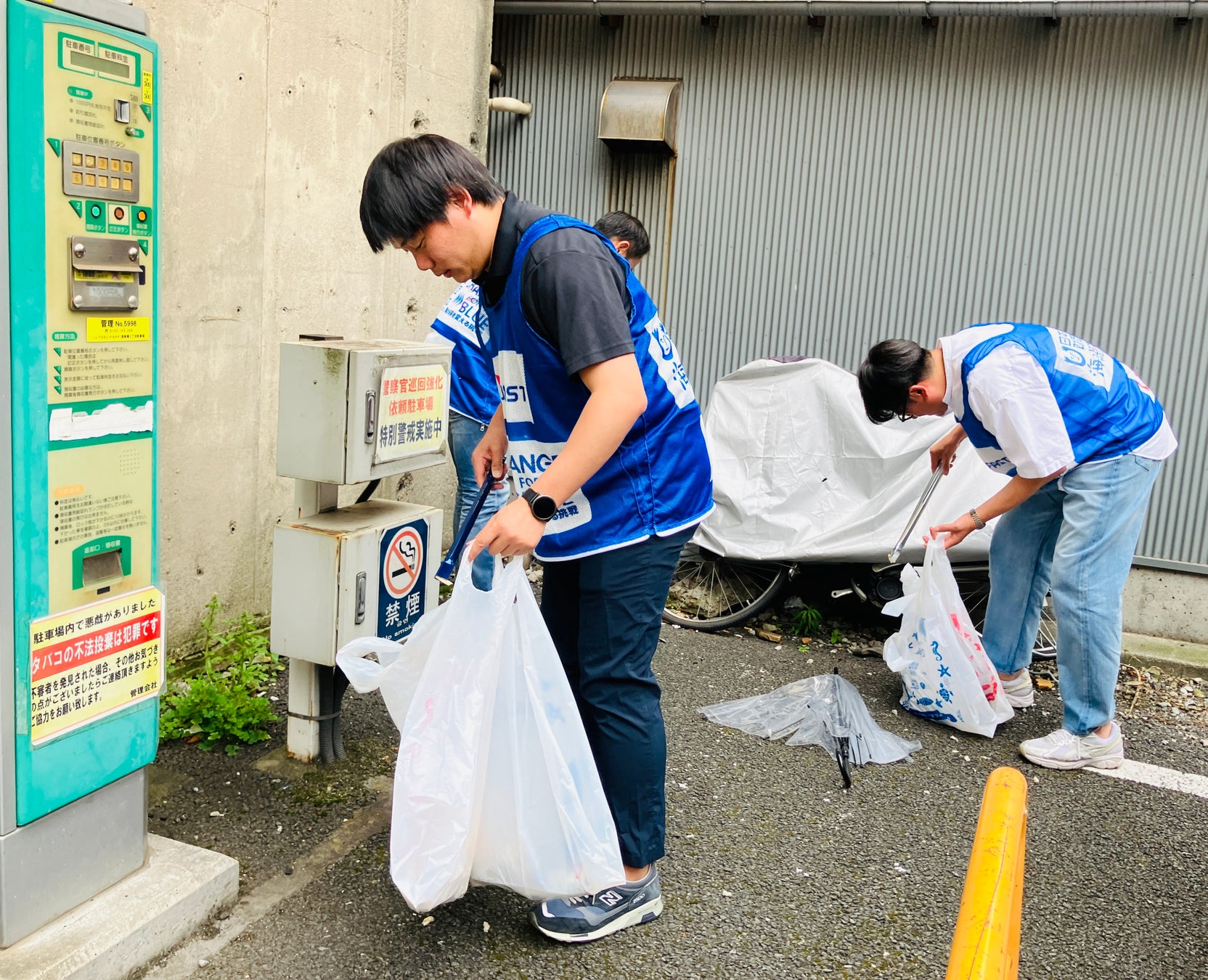 また、今年4月に入社した新入社員8名も、この地域清掃活動に初参加しました。彼らにとってこの活動は、単なるボランティアではなく、ユニファーストの企業理念「アイデアの力で社会に貢献する」を体感できる貴重な経験となりました。当日は、慣れない手つきでトングを握りながら、先輩社員と協力してごみを拾い、声をかけ合い、時には通行人とあいさつを交わす姿が見られました。このような体験を通じて、「地域に支えられて働いていること」や「自分たちの製品が社会に役立っていること」を実感し、仕事に対する誇りや責任感が育まれています。特に今回着用した『着られるエコバッグ』は、彼らにとって"入社後初めて身につける自社製品"でもありました。清掃活動を通じて、製品の価値や背景にある企業姿勢への理解が深まり、自身の仕事が社会とどうつながっているかを考えるきっかけにもなっています。