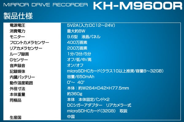大画面9.6インチミラー型ドライブレコーダー「KH-M9600R」新発売