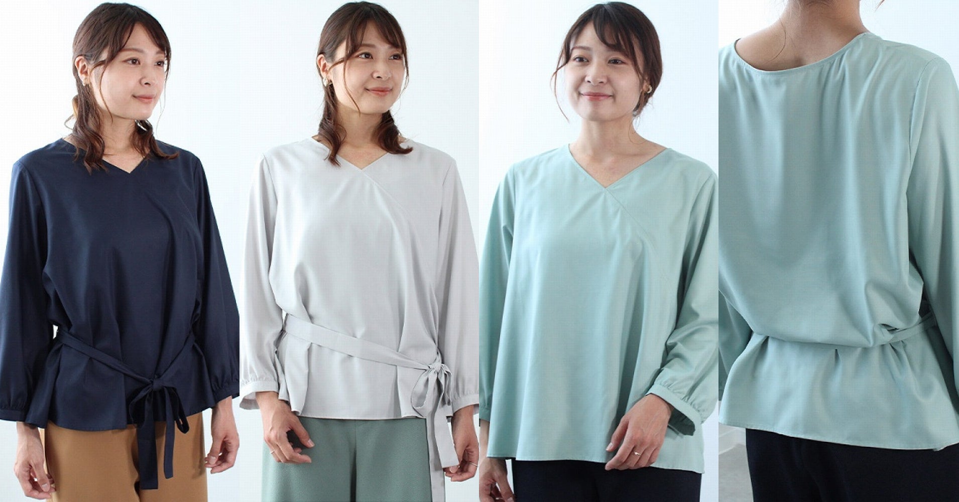 別注アイテムはAIで抽出した要素を組み合わせたラウンドネックのスモック型ブラウスをベースに作成。ネックデザインは顔回りがスッキリと見えるカシュクール風に変更し、首元の空きは胸元が見えない程よい深さのVラインに調整。サラッとした生地でインナーが透けにくく、ふんわりと着られるシルエット。更に付属のベルトを使用することでウエストを絞って着用が可能。サイズはXL〜5L、カラーはグリーン、ネイビー、グレーの3色展開。価格は¥8,800(税込)で販売。