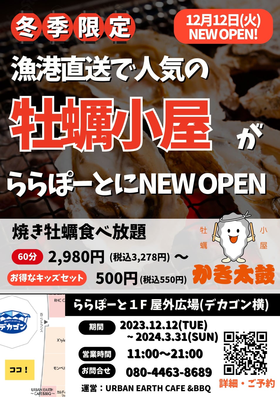 開放感あふれるららぽーとの屋外広場に牡蠣食べ放題の牡蠣小屋がオープンしました!