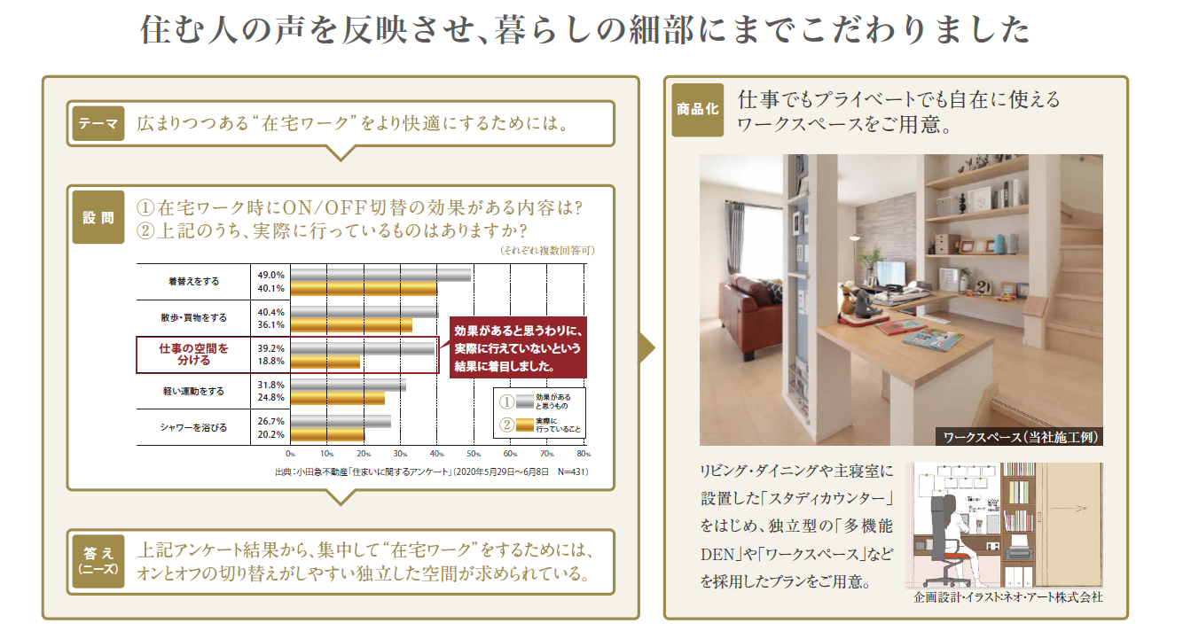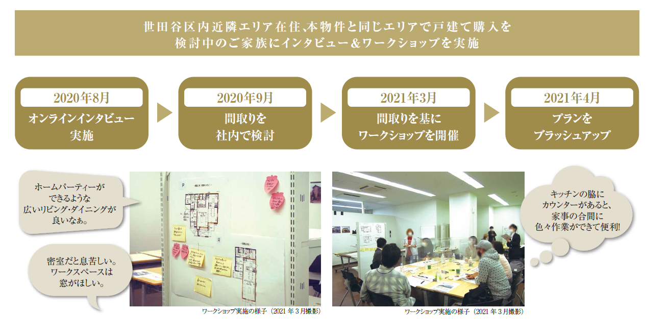 本プロジェクトは、世田谷エリアの方々の暮らしへのニーズを的確に捉えるため、設計段階より同エリア居住の方を対象としたインタビューやワークショップを開催し、在宅勤務の実態やコロナ禍における住まいに対する考え方や物件選びの基準等の価値観、さらには外観意匠や間取りに至るまで、様々なご意見を伺いながら、プランのブラッシュアップを行いました。