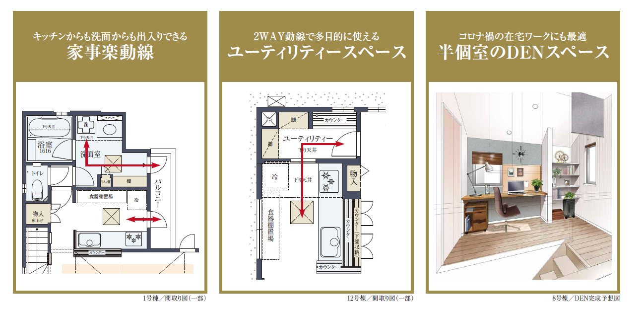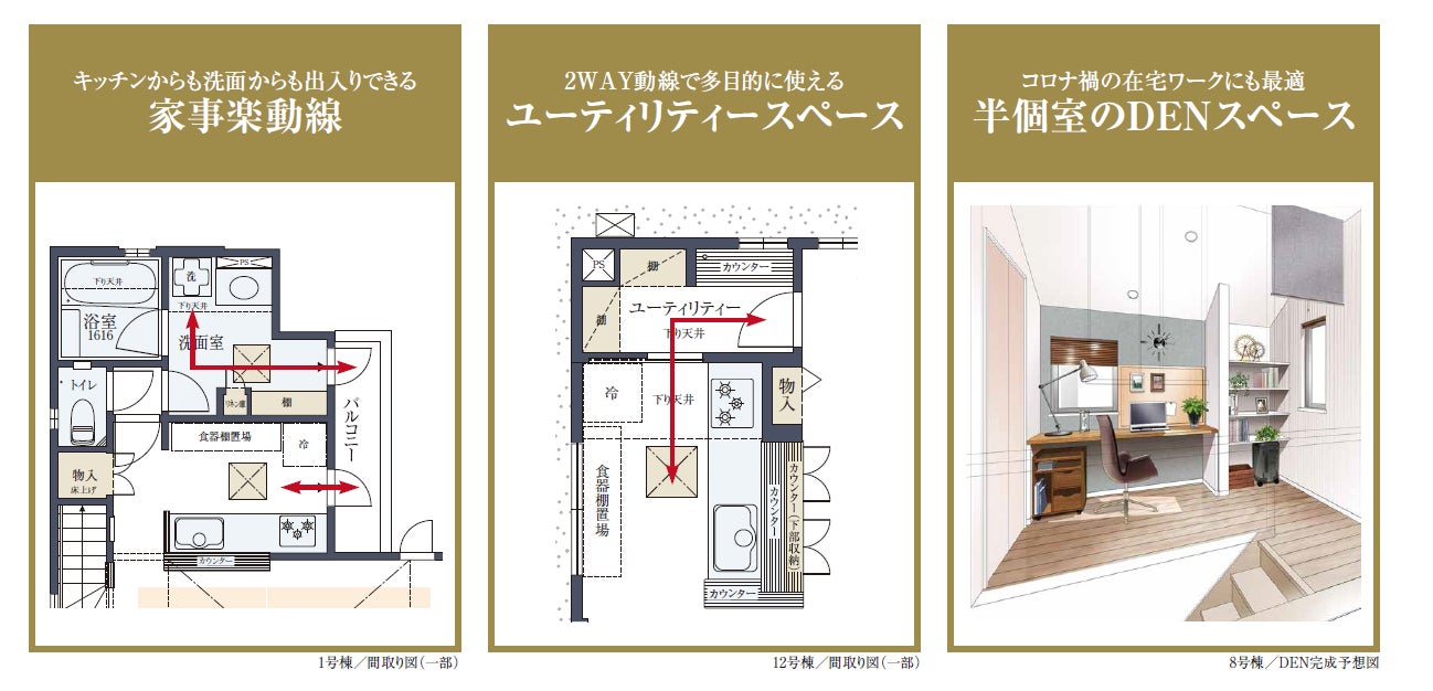 本物件では多彩なプランバリエーションを用意しています。各棟には、「動線」や「在宅ワーク」に着目した暮らしやすさを実現するアイディアを採用しています。