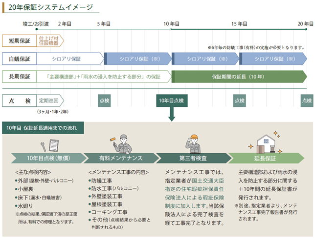 本システムは、独自の定期点検(無償)や有償メンテナンス工事を、実績のある指定業者にて行うことで、建物の基本性能である「主要構造部」と「雨水の浸入を防止する部分」のアフターサービス保証(当初10年間)を建物竣工から最長20年まで延長できる制度であり、お客さまの「ずっと安心して住み続けられる、快適な暮らし」をサポートしたいという想いから誕生しました。