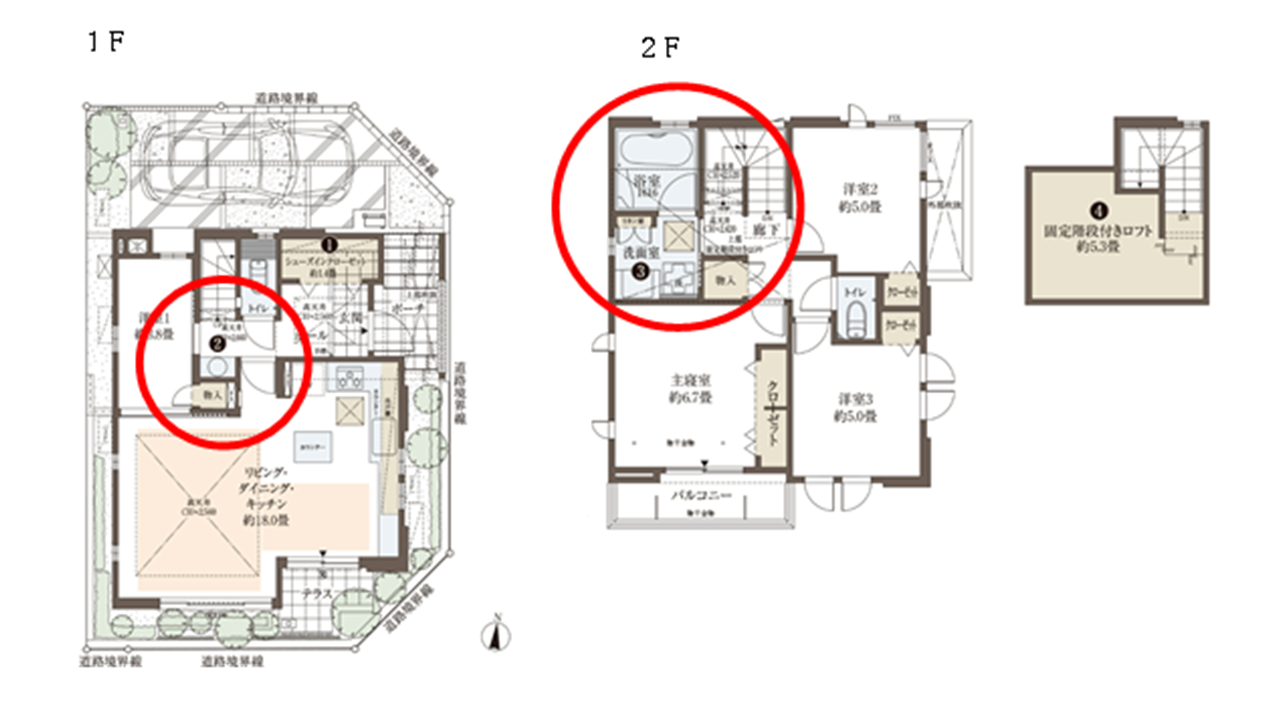 本物件の代表プランである2号棟では、withコロナ時代に対応して、玄関ホールにウェルカム洗面を設けました(間取り図②)。住戸内を清潔に保つだけでなく、子育てにおける手洗い・うがいの習慣づけにも役立ちます。またバルコニーへアクセスしやすいように洗面室等の水まわりを2階にレイアウトし、スムーズな洗濯動線を実現しました。(間取り図③)