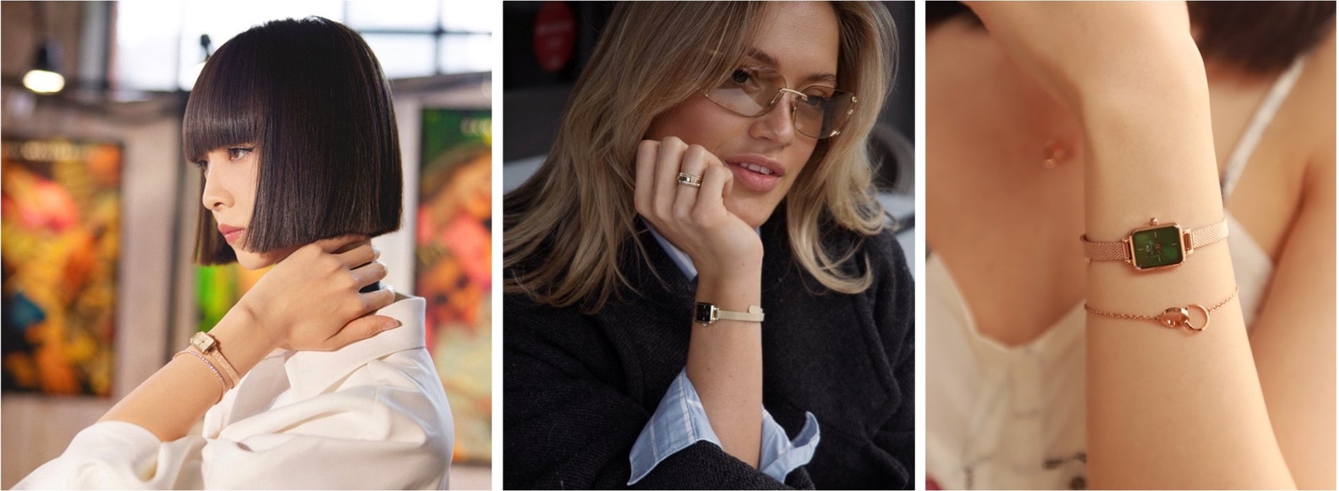 QUADRO MINIは、ジュエリーを思わせる時計としてダニエル・ウェリントンの時計シリーズに新たに加わりました。このコレクションは、エレガントで洗練されたQUADROウォッチをコンパクトなサイズにアレンジしたもので、時計でありながら、ブレスレットとしても魅力的に女性らしさを演出します。