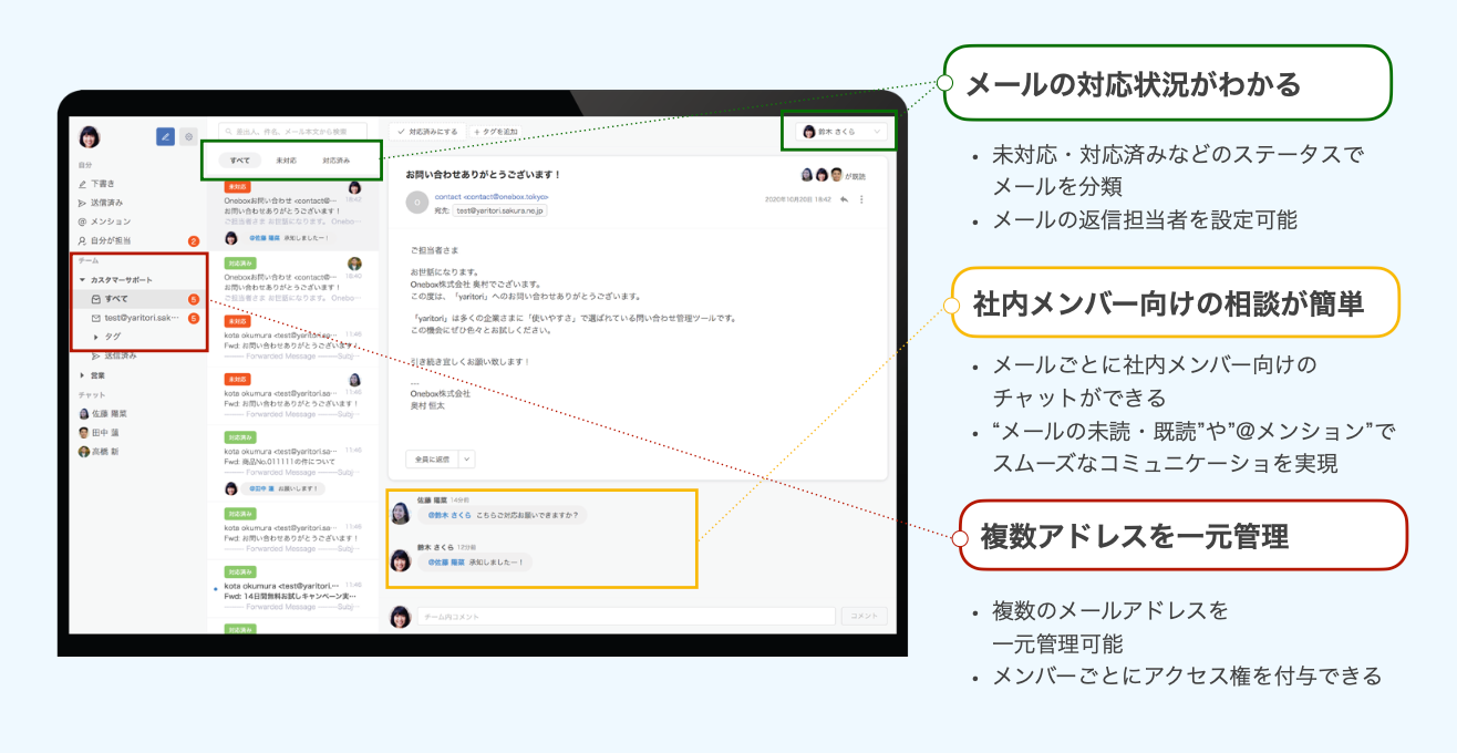 「yaritori」は、対外的な顧客対応を担う営業・CSに特化したメールサービスです。「複数メールの対応状況をチームで一元管理」「Slack・Chatwork連携」などで社内外のコミュニケーションを効率化し、迅速な顧客対応を実現することができます。