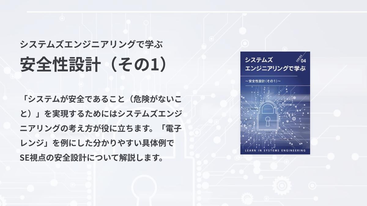 シリーズ第4弾では「安全性設計」を取り上げます。様々なシステムが社会の中で活躍し、生活を支えている現代では「システムが安全であること(危険がないこと)」は極めて重要です。そして、安全なシステムを実現するためにはシステムズエンジニアリングの考え方が大変役に立ちます。そこで、この資料ではSEの視点から安全性設計のエッセンスを解説します。「電子レンジの安全性設計」という分かりやすい具体例も載せていますので、ぜひご覧になってみて下さい。