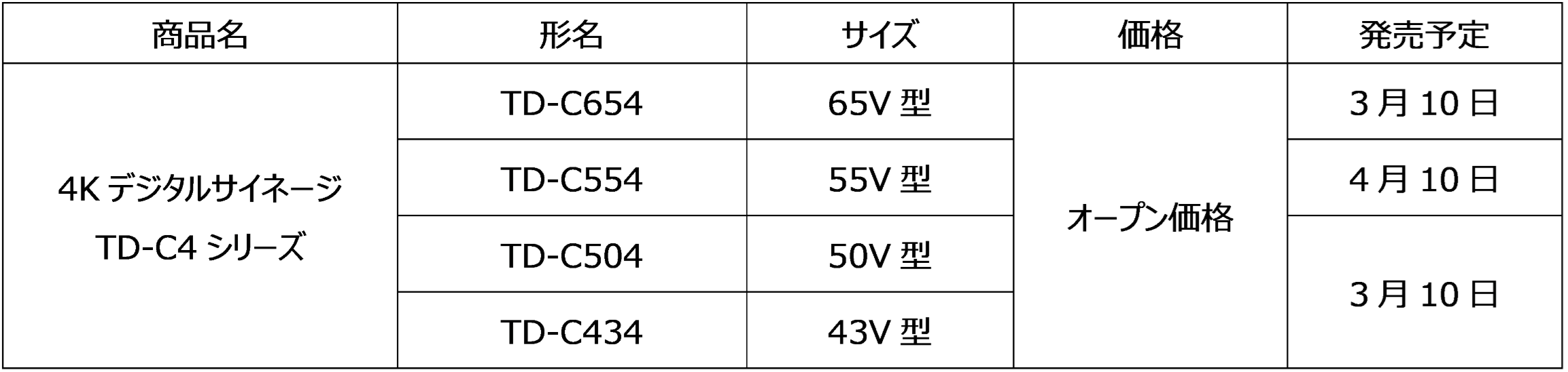 TVS REGZA株式会社は、業務用4Kディスプレイのエントリーモデル「TD-C654」「TD-C554」「TD-C504」「TD-C434」(以下TD-C4シリーズ)を3月10日から順次発売いたします。「TD-C4シリーズ」はエントリーモデルでありながらノングレアパネルを採用することで優れた視認性を実現し、店舗や施設での案内表示・情報発信、ならびにオフィスでの会議や情報掲示板用途など、幅広いサイネージ用途に適した業務用ディスプレイです。サイズも65V型から43V型まで4種類を取りそろえており、用途に応じたサイズをお選びいただけます。