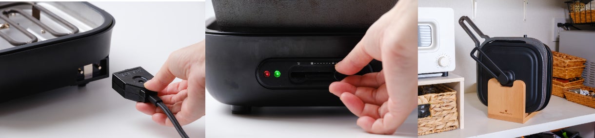 電気卓上コンロはおよそ縦25cm×横25cm×高さ9cm、1~3人のご家庭で気軽に使えます。食卓を邪魔せず、出しっぱなしでも問題ないサイズです。電気卓上コンロはドウシシャの立つフライパン「sutto」で採用しているリブを応用することで縦置きで収納可能です。「出し入れが億劫」「収納の場所をとる」という悩みを解消します。使いたいときにパッと置いてすぐ使えます。また、鋳物のフライパンは重く、電気卓上コンロに乗せると重たく、使用できないことがほとんどですが、本製品は脚部分に独自構造の「おもいのダンパー」を採用することで、重さを吸収し安定して使用することができます。