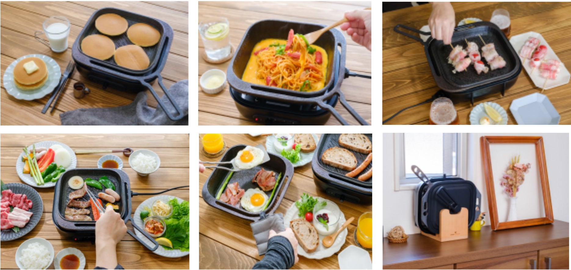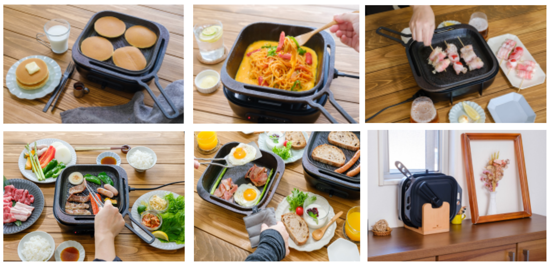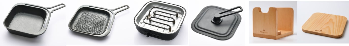 鋳鉄製フライパン スクエア深型(22cm)、スクエア頂 -ITADAKI-(22cm)、電気卓上コンロ、 ふた、おもいのフライパン スクエア収納スタンド、おもいのフライパン スクエアなべしき