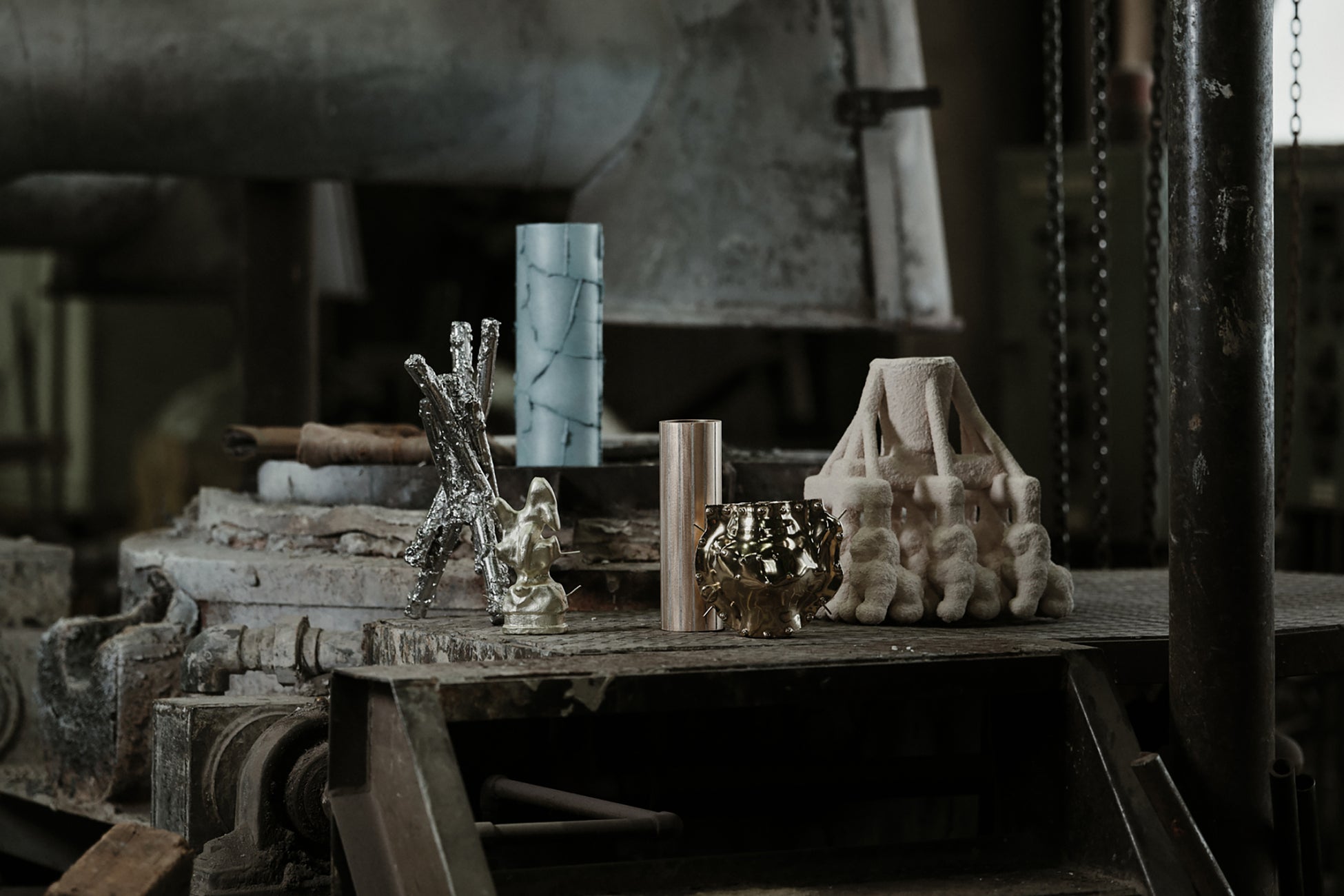 Unseen Objectsは、富山県高岡市の鋳物会社平和合金とデザインスタジオwe+のコラボレーションから生まれたコレクションです。鋳物の製造過程で使用される道具や治具、素材の質感や偶発的な造形など、これまで見過ごされてきた鋳物文化の舞台裏に着目。高度な鋳造技術の本質を作品へと昇華することで、鋳造文化の魅力を伝えながら、その価値を再発見、再定義することを試みています。⽇本で唯⼀銅器鋳造の伝統的⼯芸品産地として指定されている高岡市で1906年に創業した平和合⾦は、ブロンズ像などの⼤型鋳造からロストワックス鋳造による繊細なアート作品までさまざまな鋳造を⾏ってきました。本作品では、we+が平和合金の鋳物工場を幾度となく訪ね、鋳造プロセスを丁寧にリサーチすることで、工場で日々生まれる見過ごされてきた魅力にフォーカス。2025年のMATTER and SHAPE(パリ)、Milan Design Week(ミラノ)にて発表した花瓶のコレクションに加え、新作家具も発表します。