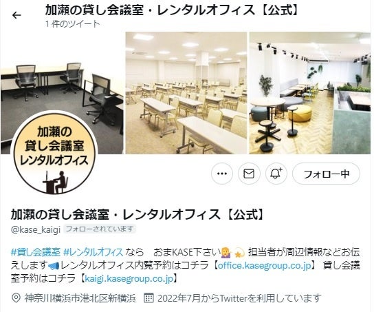 - 加瀬の貸し会議室・レンタルオフィスTwitterアカウント:@kase_kaigi