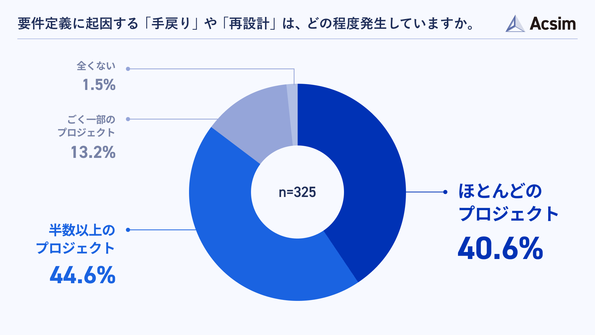 要件定義に起因する「手戻り」や「再設計」の発生頻度を尋ねたところ、「ほとんどのプロジェクトで発生」が40.6%、「半数以上のプロジェクトで発生」が44.6%にのぼりました。全体の85.2%が、“半数以上”のプロジェクトで手戻りが発生していると回答しており、要件定義の曖昧さが、後工程のコスト増や納期遅延に直結している現状がうかがえます(n=325)。