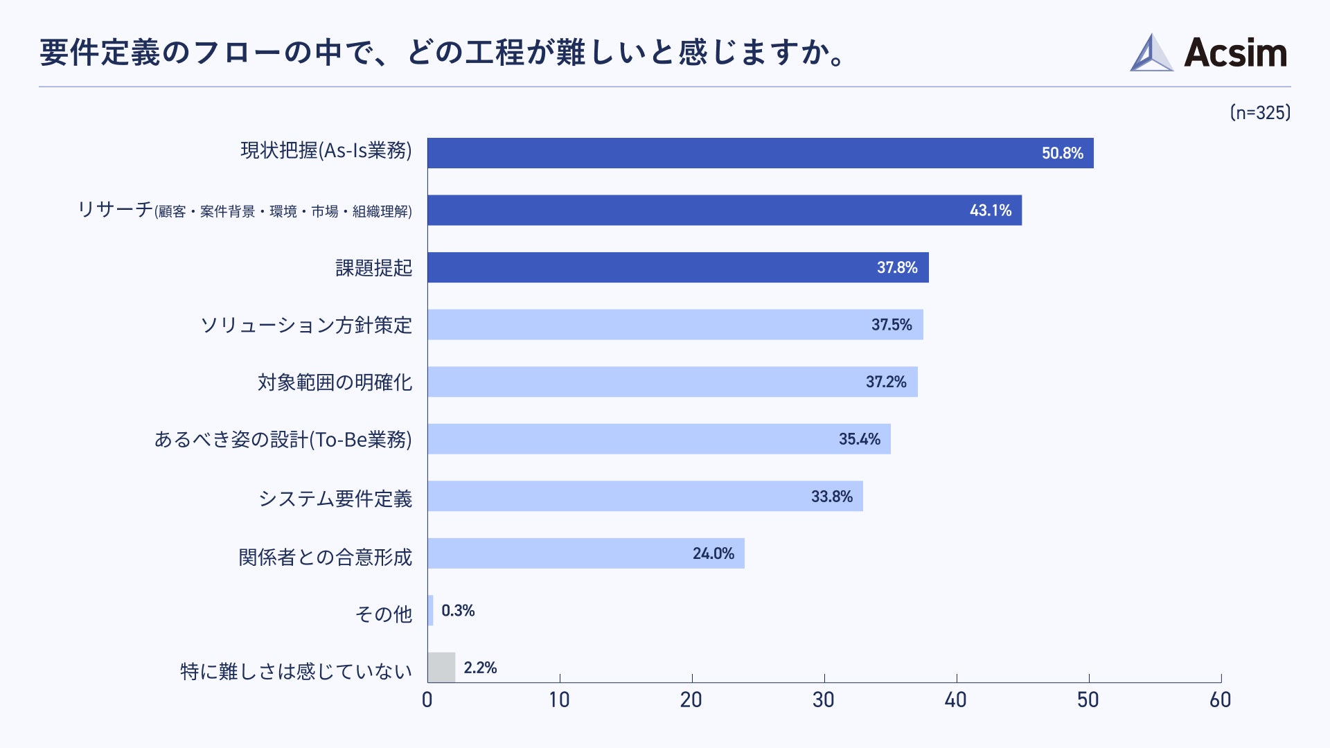 要件定義フローの中で難しいと感じる工程を尋ねたところ、「現状把握(As-Is業務)」が50.8%で最も多く、「リサーチ」が43.1%、「課題提起」が37.8%と続きました(n=325)。
